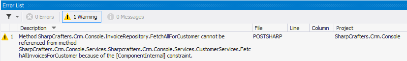 Typewhich allows you to define many different component types that should be granted access.public class InvoiceRepository { [ComponentInternal(typeof(Sharpcrafters.Crm.Console.Services.InvoiceServices))] internal IEnumerable<Invoice> FetchAllForCustomer(Guid id) { //dostuff return null; } }Now if you try to access this component from a type that hasn't been granted access you will see a compile time warning in the Output window.