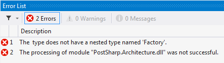 namespace PostSharp.Architecture.Repositories { public class AccountRepository { public void AddAccount(string name) { var businessRule = new BusinessRule(); businessRule.DoStuff(); } } }Now when you compile the project you will see a warning in the Output window in Visual Studio.