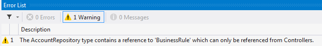 AccountRepositoryclass.[BusinessRuleUseValidation] public class BusinessRule { // Now, only code in the Controllers namespace can call this class's constructor. }Test the rule by adding nonconforming code to your project.